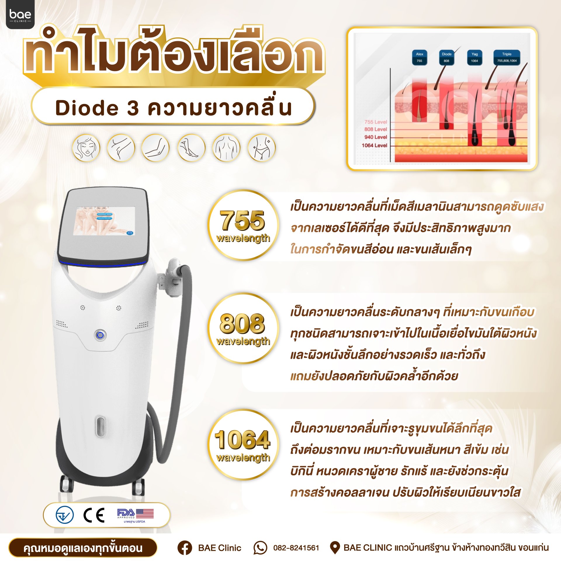 เป็นความยาวคลื่นที่เม็ดสีเมลานินสามารถดูดซับแสงจากเลเซอร์ได้ดีที่สุด จึงมีประสิทธิภาพสูงมากในการกำจัดขนสีอ่อน ๆ และขนเส้นเล็ก ๆ - 808 Wavelength